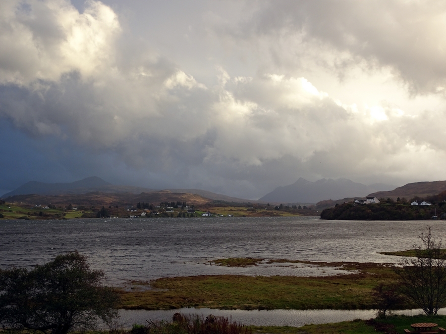 With nothing posted on the CalMac website, and no further text messages, we departed Perth at 07:15 and just had to hope the weather didn't worsen. The weather on the way up to Skye wasn't as bad as had been forecast. It was blustery wind and rain all the way, the rain was heavy at times. The only bad part of the journey was between Loch Garry and Loch Cluanie where the road climbs and becomes more exposed, surface water on the road requiring us to really slow down. We were making good progress, so we weren't concerned. By about 11:00 we were on Skye, the weather looked like it was improving slightly and we were on schedule, things were looking good. We were just 5 miles south of Portree when a text message came in to say the ferry had been cancelled, and our sailing was re-scheduled for 16:30 on Sunday. The race was now on to find somewhere to stay for the night. A lot of B & B's were closed for the season, and hotel rooms in Portree were going fast, so options were limited. We managed to get a room in the Royal Hotel in Portree overlooking the harbour.