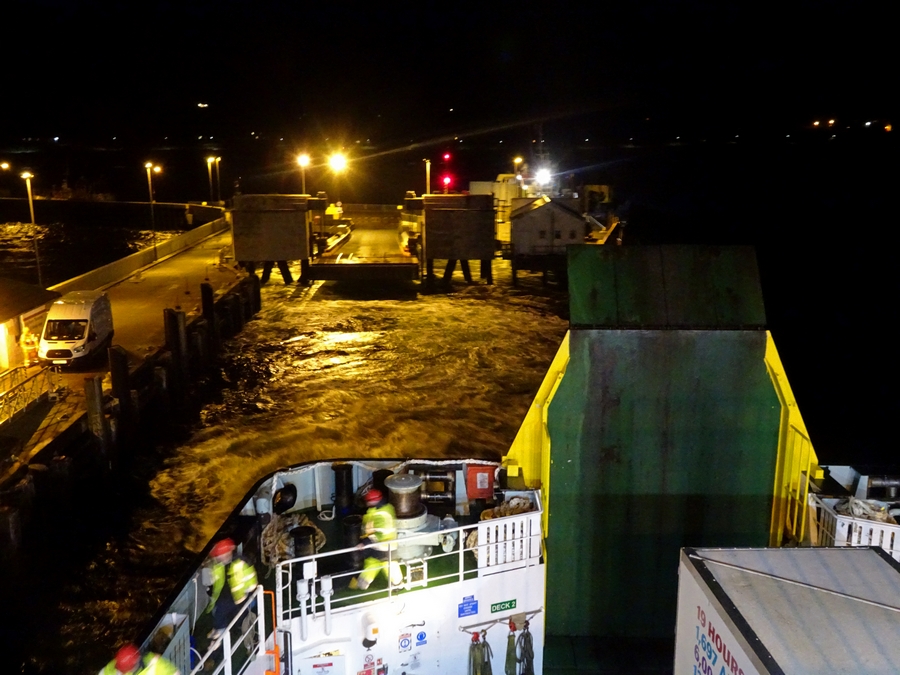 We left Uig at 17:40, 1Hr 10min later than scheduled. It was dark, so that posed a bit of a problem for me. I'm not a good sailor, if I can relate the motion I feel to what I can see, I am fine. If I can't do that, then within a couple of minutes I feel ill. Staying outside wasn't an option, so I just sat inside with my eyes closed, I could feel the ferry pitch and roll, but I was fine. The time passed reasonably quickly.