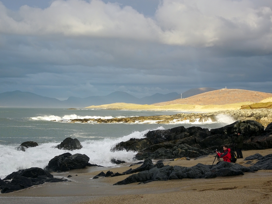 After lunch, we headed north again. The rain was almost off, just the occasional shower. The skies had started to clear and the sun was out. Several photo opportunities were to be had from the roadside, but the waves breaking against a rocky outcrop on a sandy beach at Horgabost was too good an opportunity to miss, so we headed down there for a while. To save time I didn't change into my boots which was a bit of a mistake. With the tide quickly coming in, there would be the occasional large wave which came right up the beach. To keep my feet dry required a quick sprint up the beach to get away from it, leaving the camera on the tripod behind. There were 5 other photographers there on a photography outing also making the most of the break in the weather. They had wellington boots, so they didn't have to sprint up the beach like me.