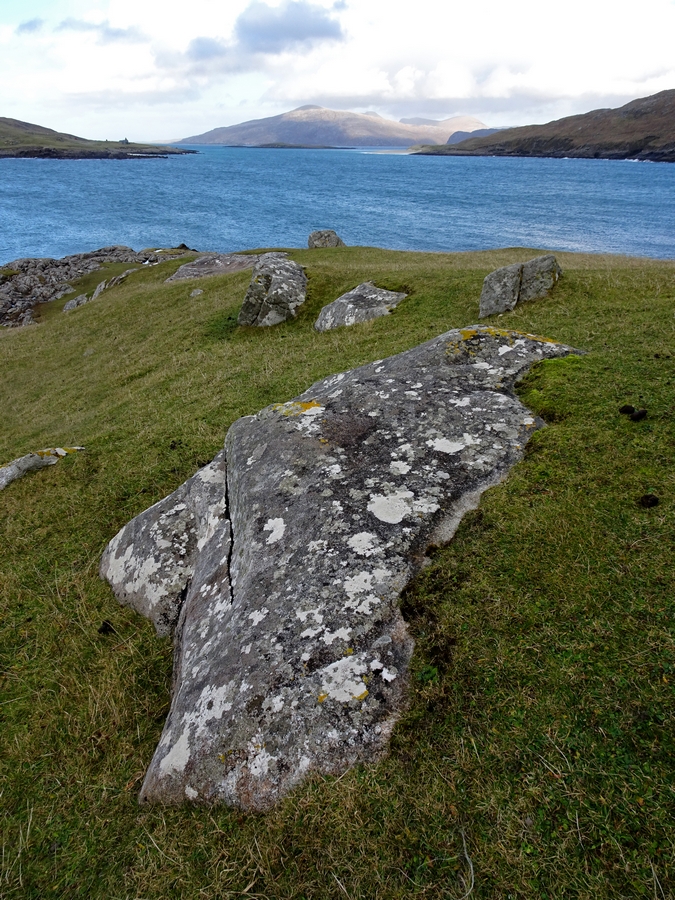 We left the cottage at 11:10 and headed to Calanais Standing Stones. Looking south towards the mountains on Harris, we could see it was raining down there, and the wind was blowing it north. When we arrived at Calanais, we had the place to ourselves. That allowed us to get photographs without having to wait for people to get out of the way. The plan to visit the nearby sites of Calanais II & III was cancelled as the rain we saw over the Harris mountains approached.