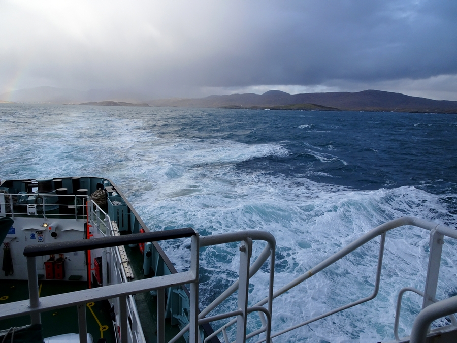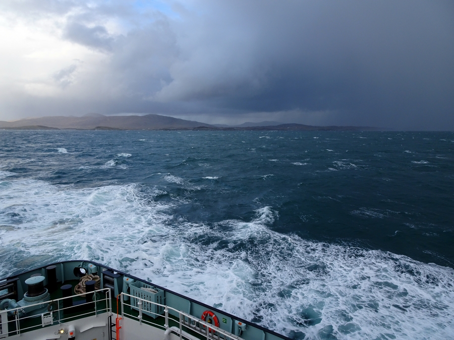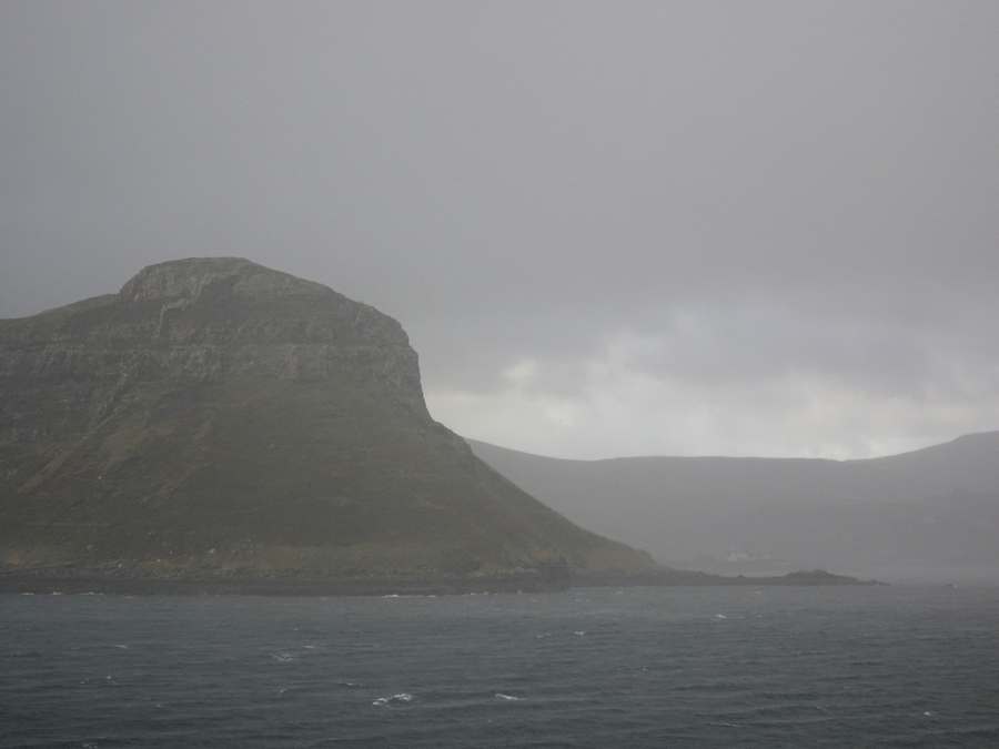 The crossing wasn't too rough, the ship was pitching and in the middle of the Minch, rolling a bit as well. The sea sickness tablets had come in handy. I spent all my time out on deck taking photos and admiring the view, Elaine disappeared inside in the warmth. The strong wind would blow heavy rain showers through quickly, so at times you had to seek shelter. The outline of the mountains on Harris gradually faded into the dark rain clouds as we headed towards the light over Skye, but that soon changed and by the time we approached Uig, we were back into heavy rain and barely able to make out the land.